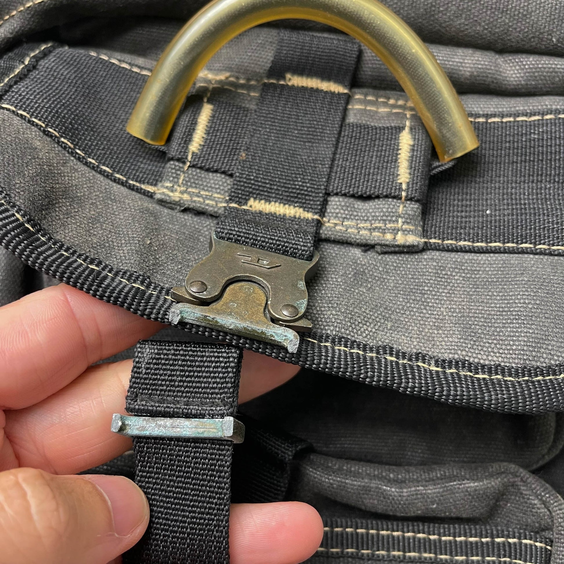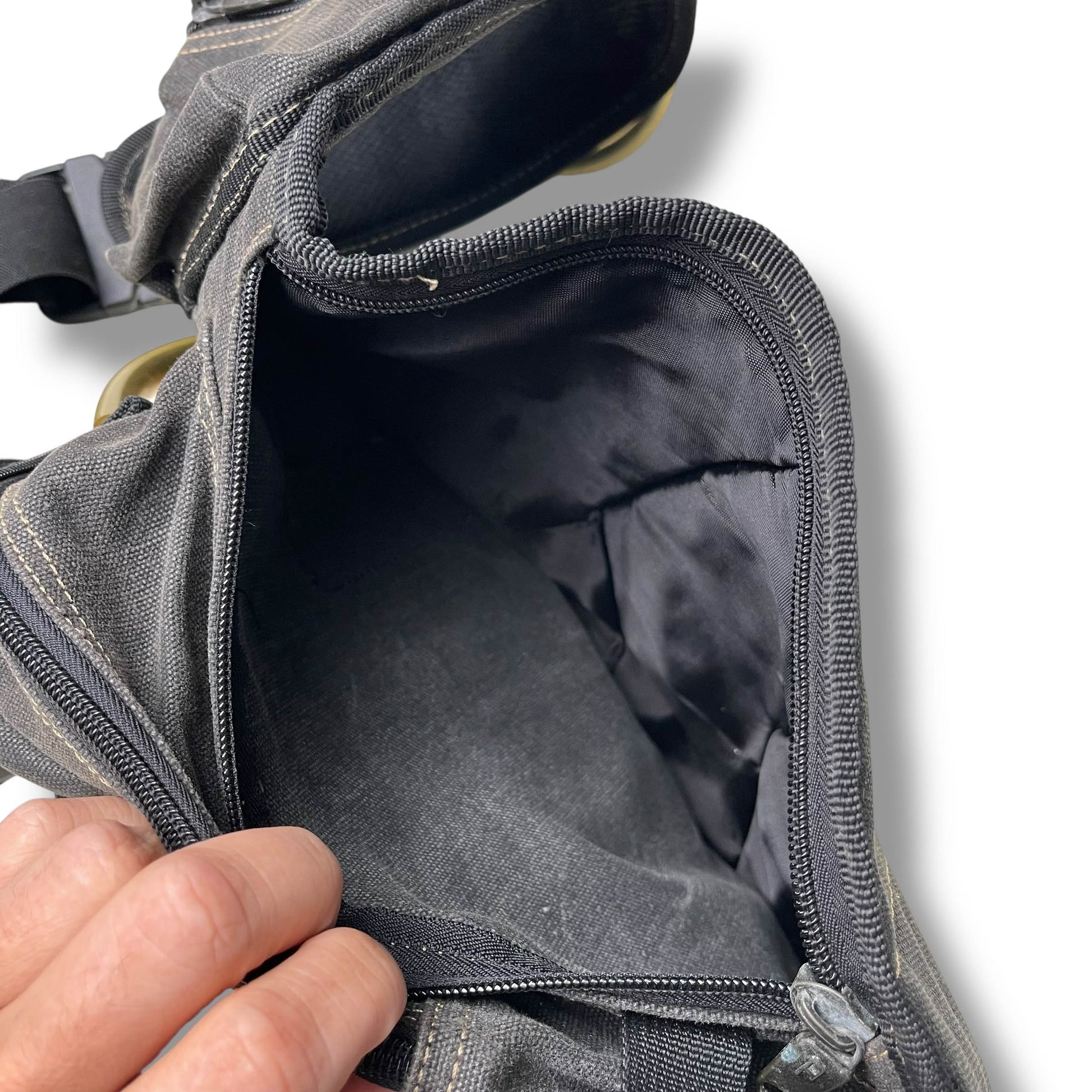 Dark Grey denim canvas body with contrast triple-stitching and utility build quality.